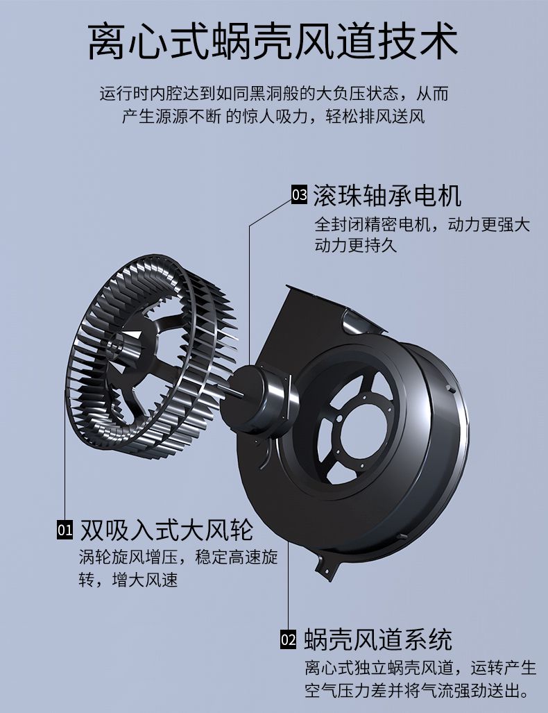 2、采用離心熱鍍鋅鋼板蝸輪風(fēng)道,安全可靠,經(jīng)久耐用,高速純銅電機(jī),持續(xù)運(yùn)行8000小時無故障,科學(xué)設(shè)計風(fēng)輪間隙,進(jìn)風(fēng)更順暢。